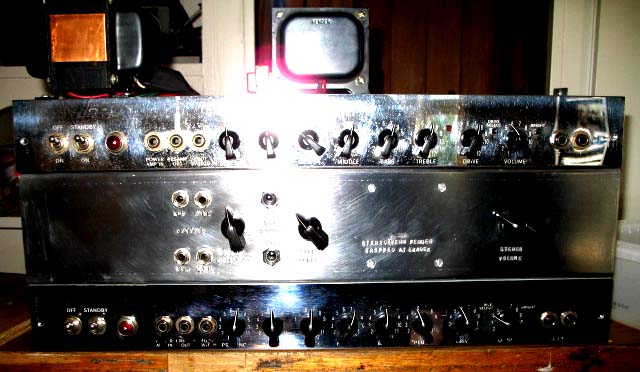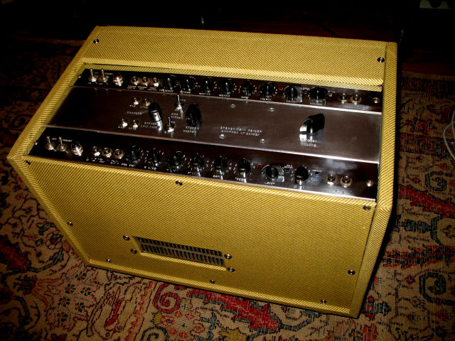 david (venn prod. & karretta) had been playing two blue devilles for a while and wanted to join/control them together somehow. so i made a new plywood cabinet – strapped the amps together – added the stereo controls – added a stereo power soaking line output device. the whole kit sounds fantastic … the speakers sound has improved from not having the chassis in them too. they have rounder fuller tone.. more resonant.