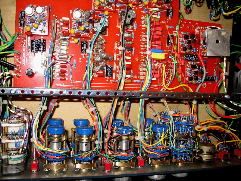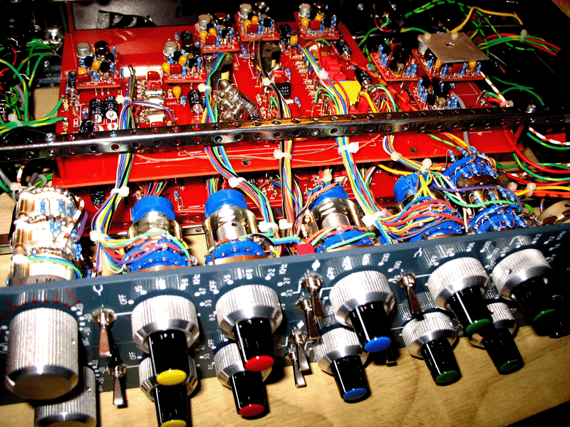 these photos are of the neve ten81 i finished making in june09. believe me it was quite a mission. not only for its complexity but also due to the instructions being incomplete and sometimes incorrect. the ten81 has a mic/line input and an equalizer in four separate frequency sections and a powerful high and low filter section. a truly fabulous sounding tool. a surgical sword and sonic sledgehammer in one. heres some conversation between my australian client and myself post delivery (he loves it and its his favorite toy) Hi Eke, Well some of the controls are still as deeply lost to my understanding as hieroglyphics– I mean I want to understand it with my right brain ( or is that left?) but my left ( or is that right?) tells me to just go with it and play into it like a saxophone. Between the different clunks and turns seems the ability to do with sounds what I have been wanting to for ages. There is so much right about the sound of this pre/eq that I don’t know where to start. Is it possible to make it sound bad?? How?? Every combination I’ve tired for the last few hours just seems to work. I think I want to just learn to understand it instictively – that my hand reaches for it and with a few turns the lighting on the sound sweeps over the different clefts and niches of the sound. Dull sources get this kind of beautiful ancient light shone on them. ( my reply) “hey. so glad you are loving that. shes a powerful axe and best treated with care tho.. for she will. as is womanly want .. bite you when you least expect it. recording too much boosting of frequencies as to shine a sound up sooo much. as then when mixed in with all the other shined up sound morsels. the soup will be all brightened tastes with reduced depth. too many shiney things for anything to shine gently anymore. delicious miso mixes uncomfortably with ice cream. miss neve is very good at wipeing away a sound into a lovely murky background too . setting the mysterious glorious black back wall of fat black big blackness” Wise words on the soup recipe, chef. the new shining powers it holds might just burn my eye out occasionally. It’s a chainsaw and a scalpel. hilariously powerful and being able to go so far as adding 18db seems like it should bust some law of audio. but it doesn’t. I’m just about to get going on another dive in … am finding that I have fallen in love with things like acoustic guitar all over again – it just sounds so good through that pre. everything really. I just tuned up the pianos as well to give them a workout on them over the week end. that overdrive is legendary for front end boosting and they pair wonderfully well with the fat ladies as well for maximum girthosity. ah.. they really have kicked me off and I have a few new tunes brewing.”