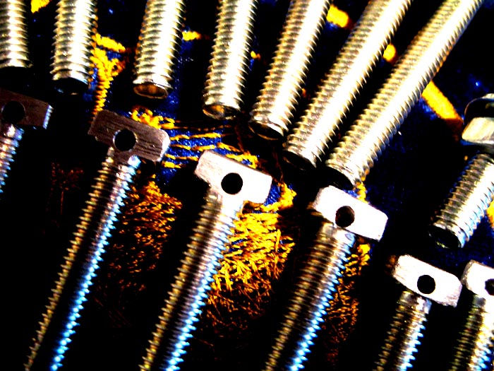 heres some details of my newest obsession. a pair of old plate reverb frames were to either come to me, or left to rust utterly. they need complete rebuilding. starting with the spring wire tensioner bolt arrangements. they are all rusted and weak. the plate verb sound is all about the plate being tensioned just right. so that the transducers can do their business. ive found some new spring wire and the hardened tags are being made. spring steel needs special tools. guilotines and hi speed diamond drills. i have made new tensioner adjustment bolts myself though. its quite a large project. the plate drivers have to made custom and the pickup devices to be sorted. there are driver amplifiers and pickup amps to make. and i have to work on them to sell now. or i fear they would probable get chucked out in the way-future for whatever dam reason. so my obsessive compulsive gear junkie tweaking and geeking brain gets another good smacking. i will make some sound tests of the plates once they work. in the meantime please enjoy a smidgen of lulus latest number entitled microphone