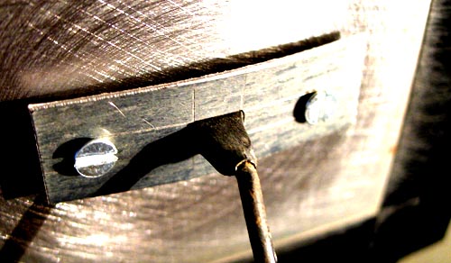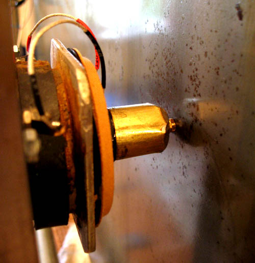 this is the driver attached to the plate with the soldered cylinder brass cone connector. and detail of the barcus berry pickup bud being held tight against the plate with a small piece of soft steel .