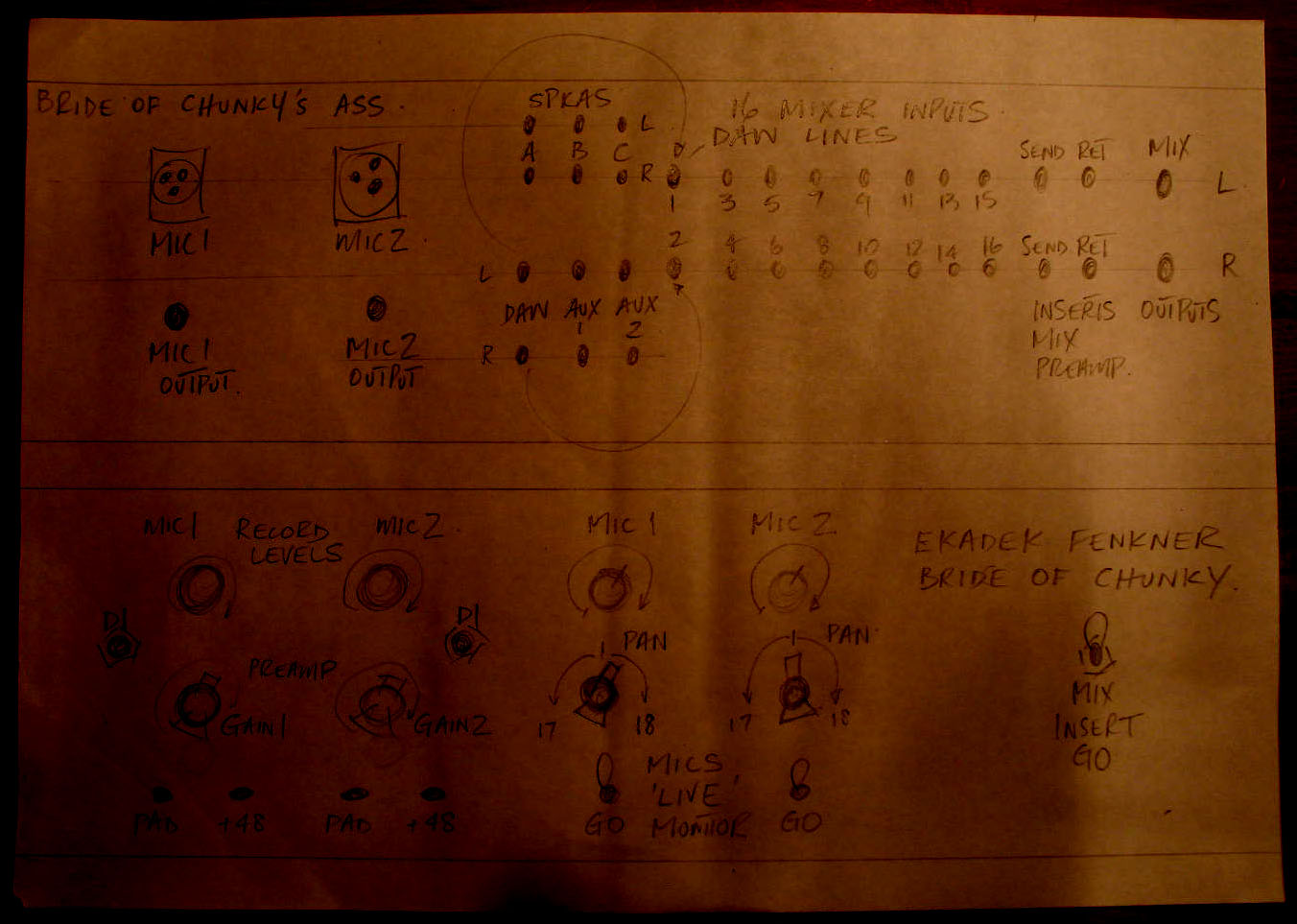 this small chunky control room monitor console is built for extreme flexibility and control and accuracy. it uses a neveish transistor control room amplifier with stereo/reverse/mono/soloL/soloR/spk A.B.C.switch/VU meters with adjustable calibration and a best quality headphone amplifier. fed from a 4 X stereo input listen select switch – mix/daw/aux1/aux2. the ‘mix’ selection to monitor an outboard summing mixer of 4 ( easily eight) stereo inputs fed from a multitrack soundcard. the passive mixer circuit and mix preamp could be housed in an outboard unit along with a power supply and all the input/output terminations . the mixed stereo signal flys back to the fenkner chunk pair of stepped level controls and feeds a neve 535 line output stage and a germanium output stage and mixes the two for double slamming sidechain action . a double power hunk’o’chunk. stop me! the final output signal would feed the mix output sockets as well as the ‘mix’ listen select position. other features are to be switched inserts across the mix preamp and the line outputs for external processors. there’s a pair of mic/di amps in the rack unit too , just to make it a complete studio in a chunk. they have outputs that can be routed permanently to a pair of soundcard inputs as well as having independent level/panned/(or muted) outputs – lets call them mixer inputs 17-18 … punching direct into the multitrack sum for zero-latency monitoring. thus the system is uber functional. the most versatile chunk of gutsy electronics ever. the rack unit is something like this. the bride of chunky.