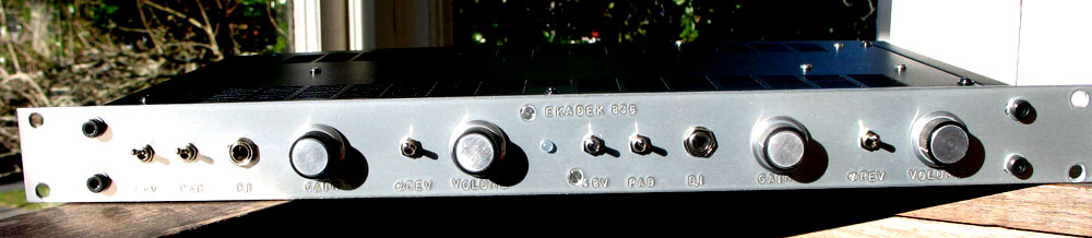 here’s the newest all transistor no chip off the old ekadek block. just soaking up some studio ambiance before jetting away to sunny canada. it has dual quarto transistor amp feedback/gain controlled stages followed by the super fat super clean neve 535 dual line amplifier. microphone input or an instrument direct input. good for +24dbm. low low noise. phantom power. mic pad. phase reverse. full floating balanced output.