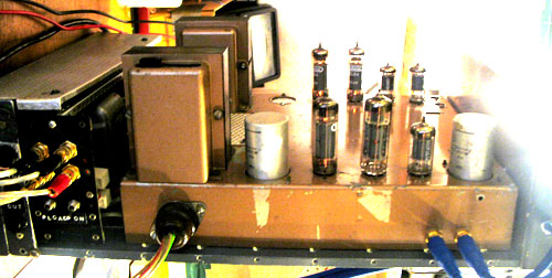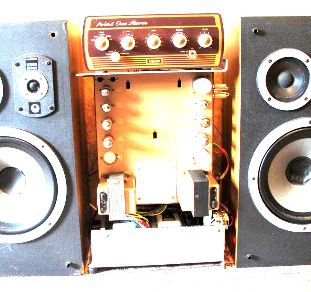 an artist client wanted my old leak 20 system. bad. and ive had it sitting upright whilst fixing the preamp . and ive grown accustomed to the new vibe. the power amp has a custom dual trafo power supply right at the bottom there. and the amp chassis … with the original single power trafo removed … looks like it’s got great big golden balls. the point one stereo preamp has new bass and treble controls which improved the sound action adjustment effects hugely of course. no small feat. the bass is a 5 meg lin dual! try and buy that from the dairy. i found 5meg board mount pots and some other dual pots by the same manufacturer & swapped out the resistor elements. he has a new balance control circuit too. it attenuates on the input circuit now, rather than the output. the overall sound is much alive with that preamp output loading left off. the wharfdales are my workshop throwaways but you can tell that pumping up some longlegged altecs with extra horn bossoombas is going to rock it. woof!. (i definitely have to get out more)