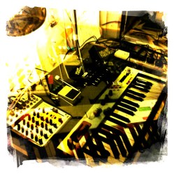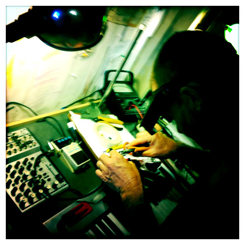 a jamming rig comprising . theremin . keyboard . delay . mixer. notorious auckland skalliwag mikey brown from CRASH TEST FOR FAVOURITE THINGS has been a complete knob head for ever now. he got his brothers friends uncles boygirl friend to make a custom wood tray – fitted with punched out memory foam to suit for his rig of death and musical deconstruction destruction rig. pretty flash actually. i spent some time sorting out a nice short cable circuit -tidy with room to play . and boom!. awesomely tidy ruination ensued.