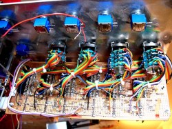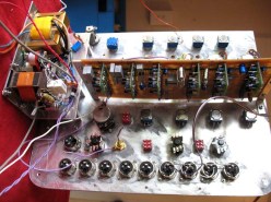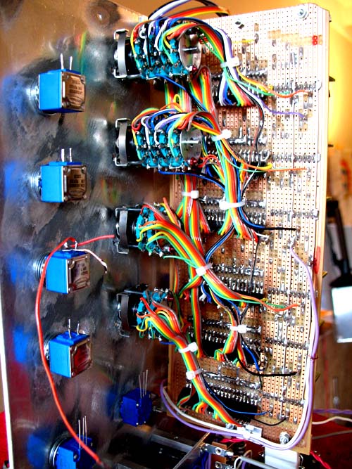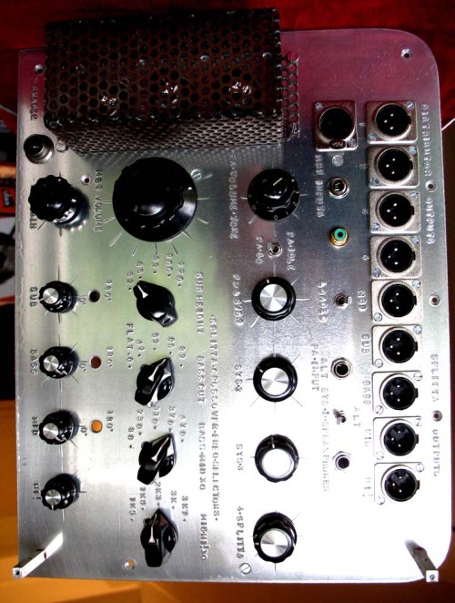 igor spent the day testing and tweaking his filter circuits. 4 eight pole switches controlling 12 active frequency filtering operational amplifiers. an uber complicated device with a few hundred things to potentially get wrong. igors dam good and smart tho and they sound awesome. 4 clean bands. sub- bass- mid- hi with sweepable crossover frequencies. it will no doubt become our new studio mastering sound splitter equaliser. a stereo control version would need 16 pole 5 position switches. woof. and it will eat your computer for breakfast. late last nite i got excited and rough assembled the front panel to see what it was going to look like…. and it looks pretty cool i think. so absolutely unique. but this morning i scuttled our progress totally. after noticing some paint spottiness. well.. it actually looked like someone had spit up on the thing. and we cant have that can we. so its all dismantled now for a few days while that gets redone. gives me time to admin and fix the car and mow the lawns and the dishes.