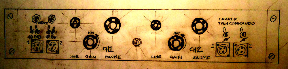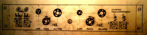 the commando is a naked preamp with no annoying reach around issues. read on. its inputs and outputs and controls are all all right there up front. . perfect. theres no reach around issues. its actually a lot easier and efficient to assemble all the components of this multichannel preamp on one surface. then u can build a chassis with a power supply in the corner – totally prewire a whole amplifier circuit unit of pretested channels. – pre assemble the control and interface parts onto the clean conductive panel – stop for lunch – make the grounding sheilding conductivity of the panel / chassis / cabinet. – trim and attach all the wireing to the controls and switches . and boom. turn it on . almost dinner time. (i wish) but actually very efficient. very easy to be super tidy. all the wireing at the inputs is as short and direct as possible. more like a point to point style construction. more robust too. nothing flimsy – just strong hardwired connections. the amplifiers themselves are the sexchanger transistor designs. simple tough hi fidelity amps from the late seventies. yes they are quiet running and super fat gain cells. big and clean, and yes . they can distort if you push them. there is a fine cross adjustment between level in. amp stage gain , and pickup amp volume. well worth the journey. the quad unit contain two stage amps. im considering a three stage design – for super clean super full on 80 db gain. or beastly extra fucked up distortion. extra squared square with your square.