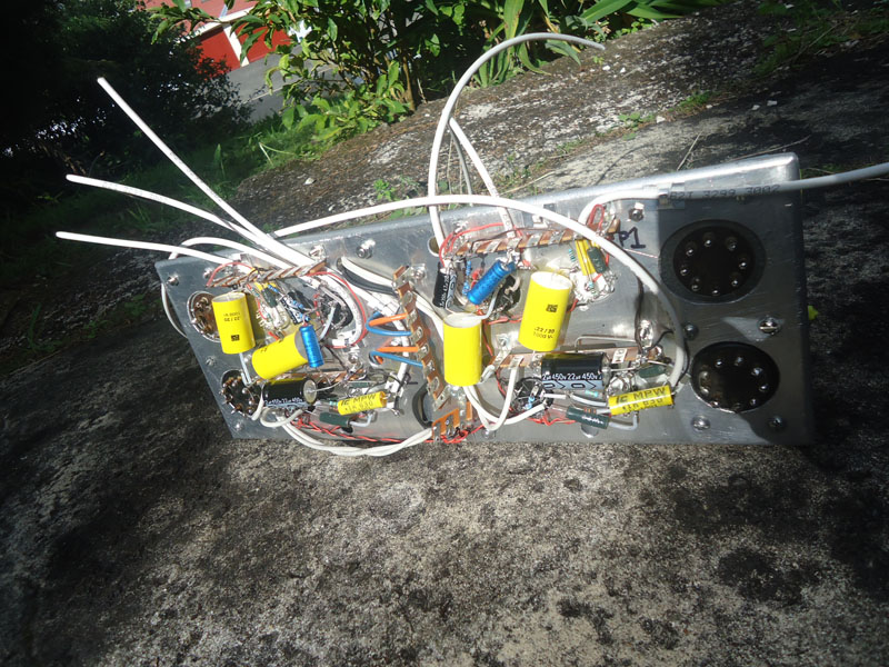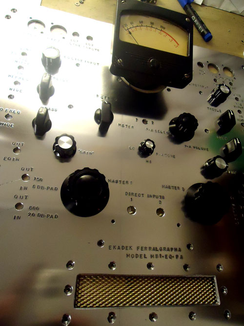 ive drilled up the panel and letterstamped it. it’s been bent to fit the cabinet properly and is getting anodized as i type. while it is soaking . i’ll finish and test the tube chassis. 8 tubes . 6 signal transformers. my evolved prototype chassis sounds great – really open feeling microphone sound. the tube amps – the very flavorful equalizing possibilities – and the in/external monitoring functionality make the ferralgrapha a complete one machine for studio or live recording sessions.