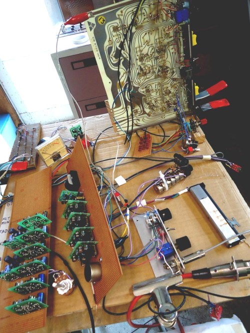 the all transistor channel amplifiers are on this motherboard along with the jensen input and output trafos (ex of other parts of the trident console) . theres two gain controlled amps in series as the mic/line amp. the series gain controlled preamps push the signal so long far forward with no noise – effortless big gain. and then a fader and post fader amp. theres also an amp for the extra input section to feed the extra stereo output buss. so many extras. and then one other dual amp board that creates an isolated clean monitor send for a headphones system and a meter feeder..to . ah. feed the meter. the other mother (r.h)- board is a stereo twin inverting stage buss amp and control room amps and stereo line buffer amps designed to be a recording and monitoring unit for andrew’s loungeroom desktop computer set up. more pictures to come.
