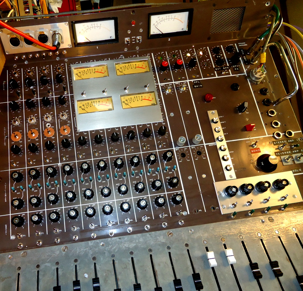 i rescued this desk in melbourne about 1996 from the infamous RAY EMERY – he was a sound guy of years and years who had a house in the sticks piled high with old tech of all sorts. he was an awesome guy who was very generous with parts and infos and rum. the other desk i could afford at the time was a mackie style . i hated those measley thin heaps with zero headroom and bad eq. i.e no fun.