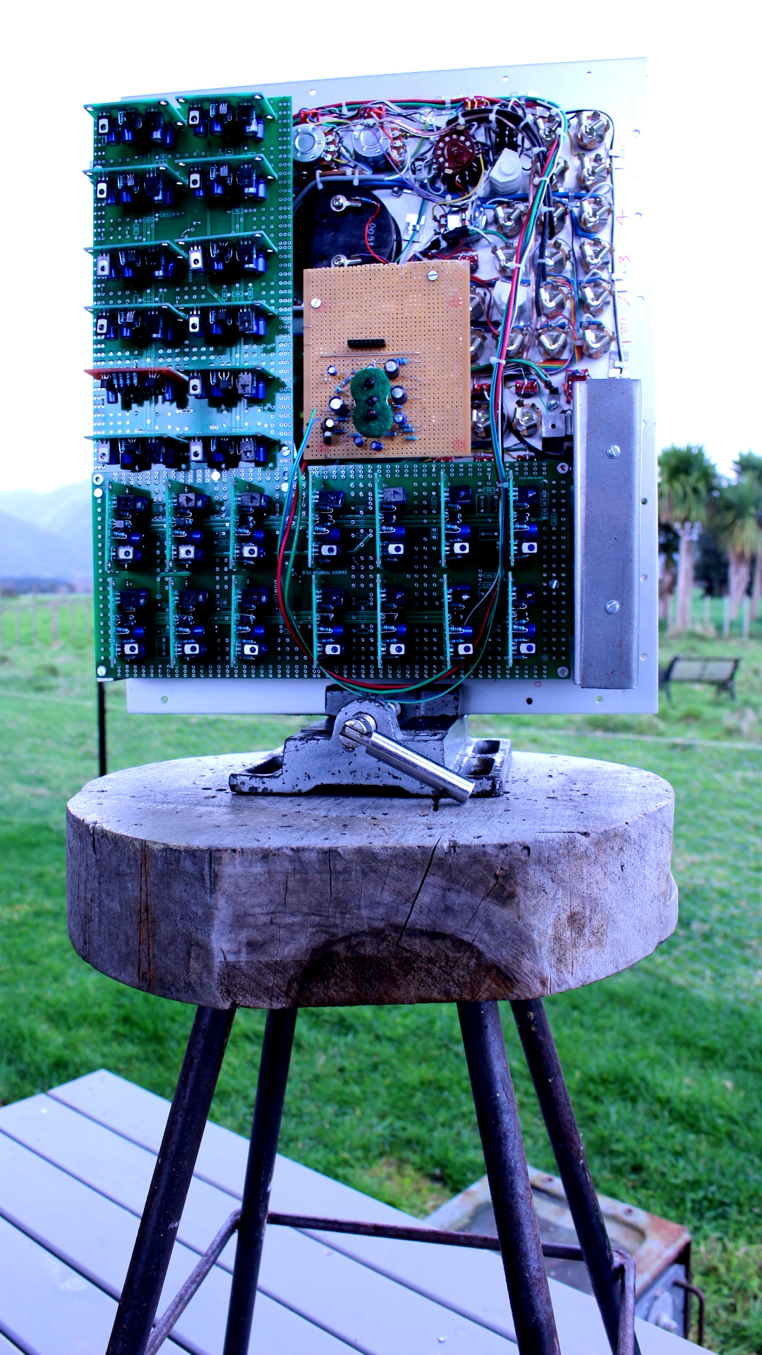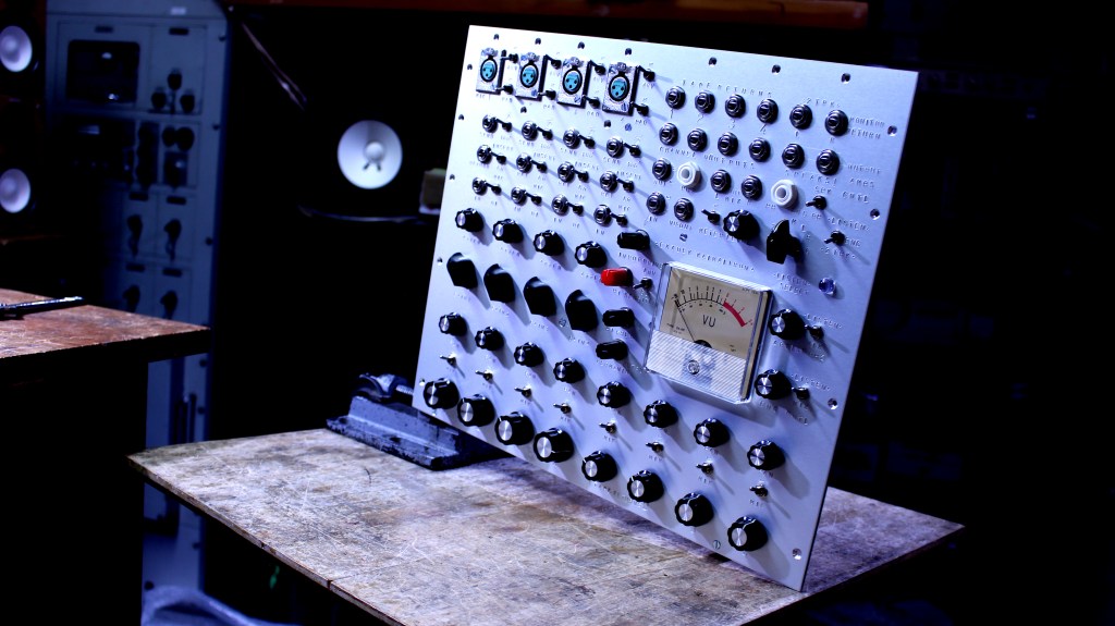 this newest kaimaitron off the block is specific for using to feed a four track tape recorder AND monitor mix that machine. all sweet gain adjustable neveish transistor amplifiers. stereo bus. simple control room. separate artist – engine ear headphone amps. works as 8 into stereo mastering mixer . also has single funky germanium transistor amplifier. patchabled. size and bitchness adjustabled.