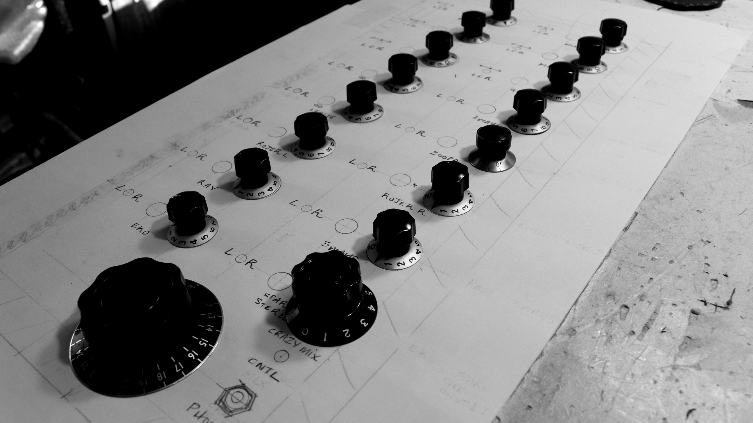 layout for 16 chan single input matrix mixer. driving stereo headphones. all transistor amplifires. each input is volume fat bat go! switch — left:centre:right monitoring send switch. there’s one other switch to swap over to copying the console control room main monitoring switcher. and one freakin big headphone drive level knob.